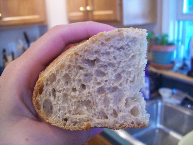 No picture of the spelt exterior for some reason...thought it was pictured in the groups but I guess not. It was not very impressive anyway. Probably the worst scoring I have ever done. Here, though, is the crumb, which is the best I've managed so far. The flavor was also delicious, and more sour than I would've expected considering I did not retard for more than an hour.