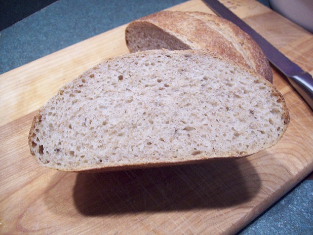 The inside of the rye. It was nice, but not as open as I expected. I only went for 25% rye because I can only find whole rye around here. I did add a little caraway seed, but not a whole tablespoon because I didn't want it to take over the whole flavor. That probably wasn't the greatest choice because it only seemed to muddy the flavor a bit. I will taste it again later.