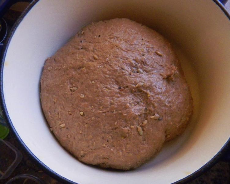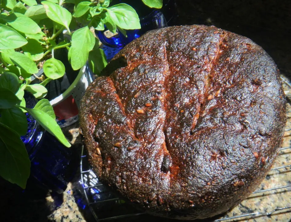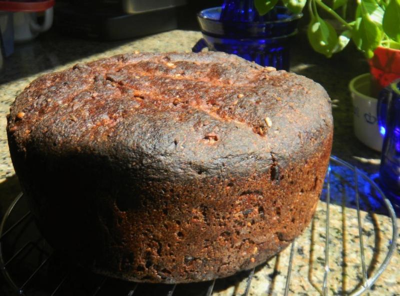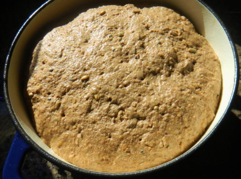 back to her long list of stuff in a complex bread. When we cut it this after noon, we hope the flavor really comes through - it sure smells good and the crust softened up overnight as we expected.