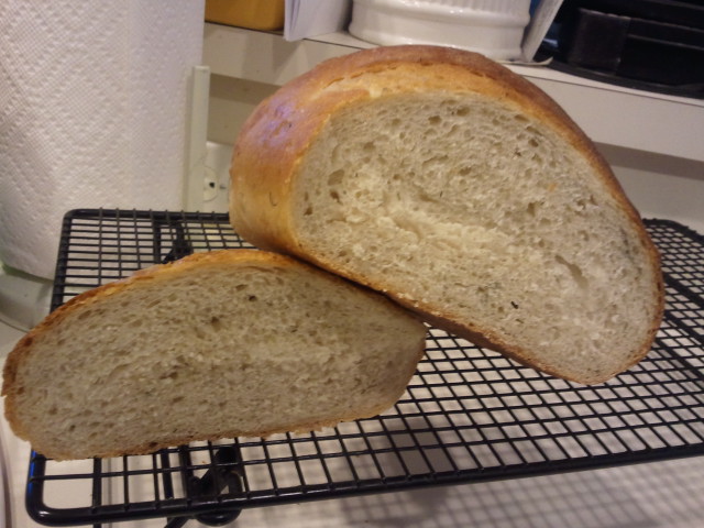 white bread Ihan I have ever seen outside of a grocery store? Always something new too. Never baked bread with fresh dill before but with the way Scandanavians love their dill and rye bread, can't see why that combination wouldn't be popular as all get out there. Another fine bake. I wish could bring my apprentice to slash that deep ! Very rustic! Something weird going on at the bottom of the boule. The no stone was probably the cause. I say cut off the offending part for the birds. The rest sure sprang and browned quite well. Nice sandwich bread and the grand kids and toast with jam won't mind the missing the extra bottom crust at all. Very nice baking.