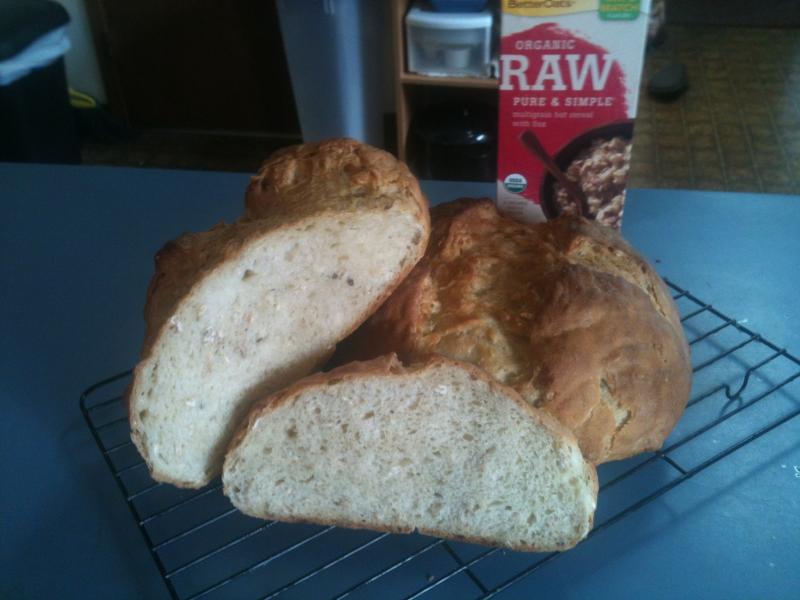 The little KA recipe boules turned out looking like scones, think maybe I slashed them a bit too deep :-)). For the KA one I added two pkts of oatmeal and left the Oakland sourdough plain. Baked the KA ones on the baking stone, first time I've done that in a while. Oakland dough was nice to handle and didn't collapse on the way to the DO which is always nice :-))
