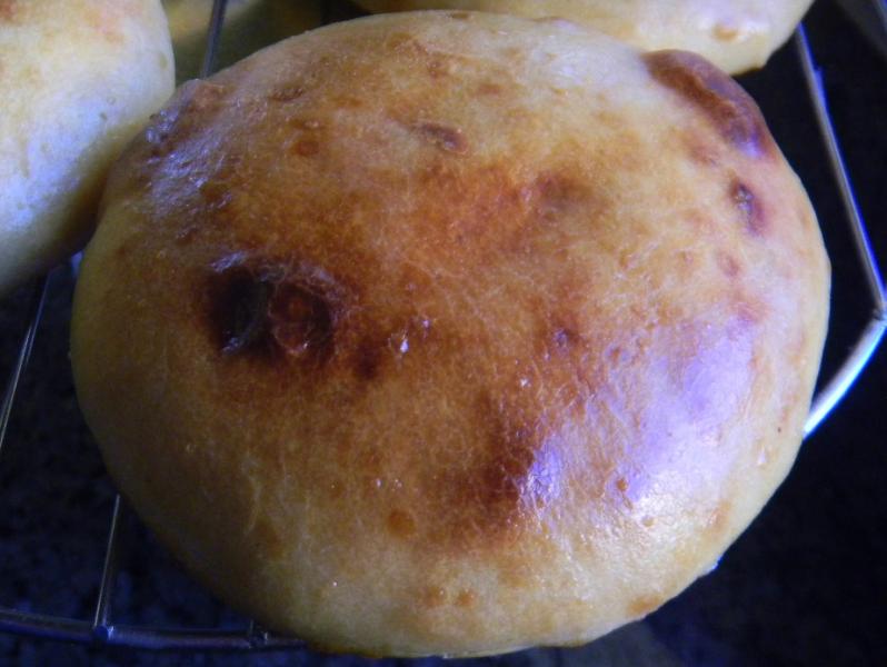 After proofing for 2 hours, the 4 buns were egg washed and then baked at 350 F convection, in the mini oven for 20 minutes, rotating them every 5 minutes.    They came out splotchy brown which was weird for egg washed buns.  We forgot to wash them with milk while still hot.  They were still fairly soft curst wise.