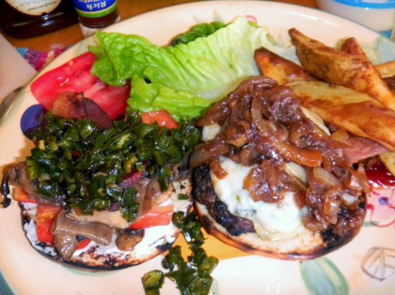 The crumb was soft and moist.   They tasted OK for white bread and when grilled with the hamburgers they went glossy dark brown on the crust and were much more tasty.  The fixings included caramelized; poblano peppers, onions and mushrooms, maple smoked bacon, home grown tomato, lettuce, pepper jack and brie cheeses.  Sides were the usual sweet and regular baked, seasoned steak fries.