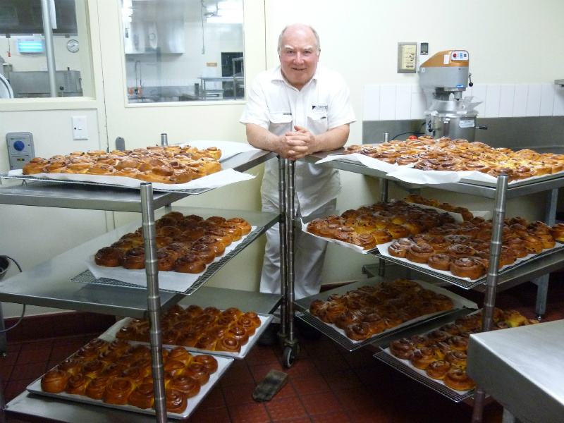The instant dough was scaled and preshaped and given a short rest on the bench whilst we enjoyed a coffee. from then on it was me rolling out the 1.2kg dough pieces washing and applying the cinnamon sugar and rolling up with Michael cutting the logs into 12 x 100g divisions and placing on the trays and into the prover.