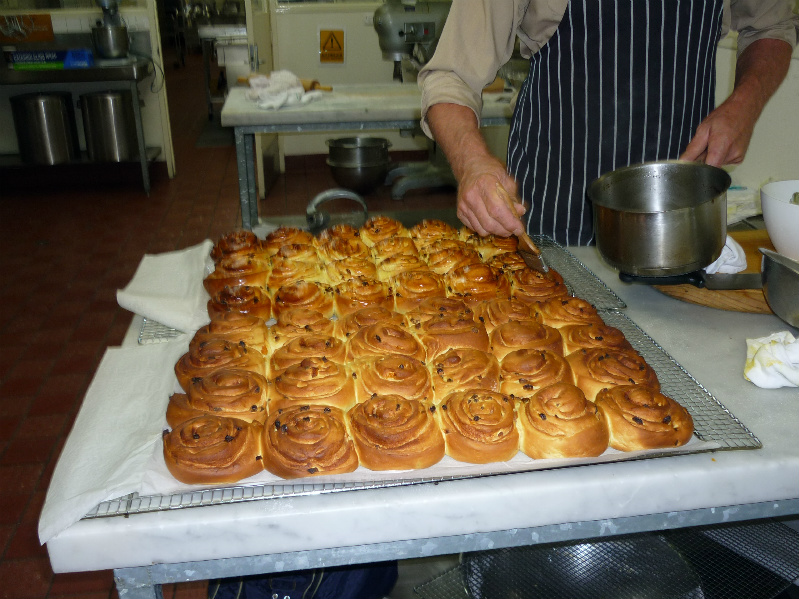 The first timed dough was now ready and we followed the previous pattern, we were hitting our straps. We soon had the proover full so we utilised the secon Unox oven as a proover as it could be set very low, the first lot of scrolls soon were ready for the oven, time for another quick coffee and prepare the bun wash.