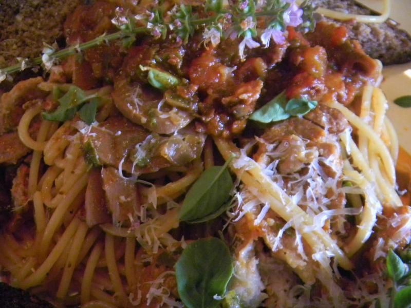 The gravy went well and turned out tasty even though we only had hot Italian sausage and some pork chops that we flattened out and stuffed with cheeses, herbs and sausage and then rolled up into larger tied sausages that we browned in a pan. The tomato sauce came out tasty too, just the way we like it, spicy and dark with the crushed red pepper, chicken stock, mushrooms, onions, Cabernet and Swiss chard.