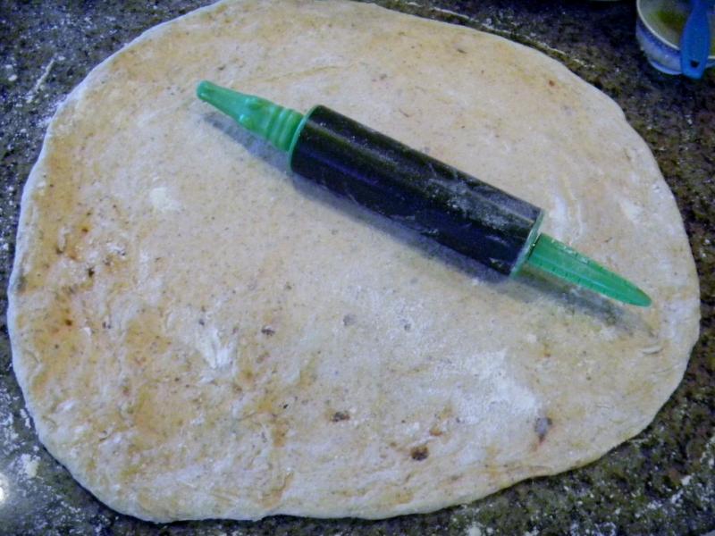 After hand forming I had rolled out the middle with my new, mini, black and green, alligator rolling pin found at Goodwill just for this purpose - it worked beautifully. I covered it in mojo de ajo, docked it and prepared to par bake the crust for 3 minutes as we always do – but this was a don’t.