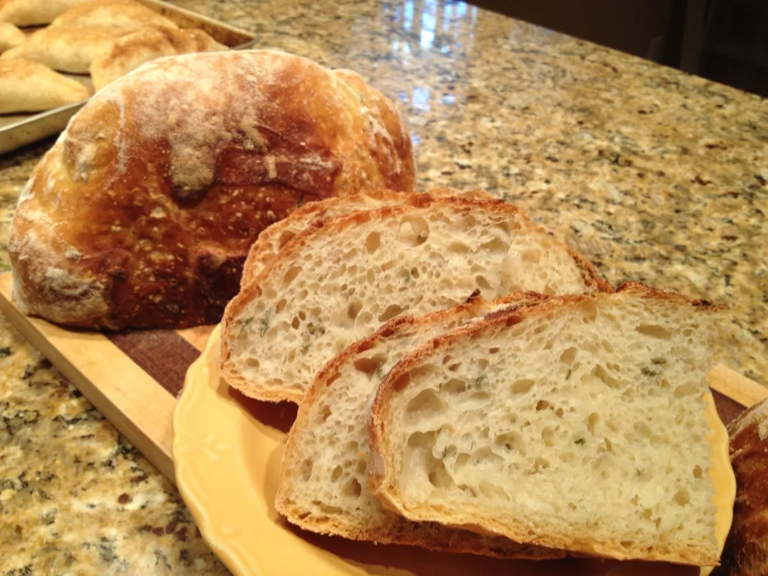 Tested a variation of the Jim Lahey No Knead bread recipe. Have had reliable success with the original, so I made a batch with rosemary and green garlic. Full bulb of green garlic, and about three 6-inch long sprigs of fresh rosemary, needles only. The dough was much more sloppy wet when it was ready to come out of the bowl and be formed, almost unworkable. Took a fair bit of flour to get it off my hands enough to form a loaf, and was a pretty squatty pancake as it rose. It baked up amazing!! Excellent crust color, nice crackle, best interior so far (crumb?) nice and airy, full of big holes. So, why? More moisture, does it necessarily yield more airiness? Airiness have anything to do with garlic or rosemary? Same tub of flour as other batches, same container of yeast, similar house temperatures...
