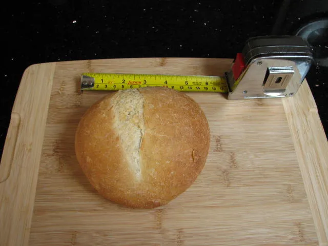 When shaping the baguette, I started with dough weighing 303 grams (as previously mentioned). After shaping, I had a baguette that was approximately 2” in diameter and 15” long. With equal sized dough pieces, my batard, after shaping, ended up being about 3” at its thickest and about 8” long, while the boule ended up about 4” in diameter. The boule photos show a boule of 5½” in diameter after baking.