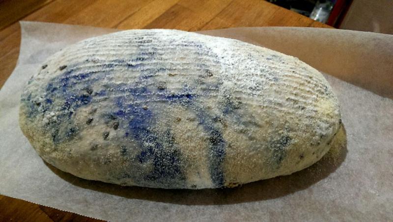 natural blue that keeps its color after baking is indeed rare. Your bread is lovely especially with so many non gluten flours involved. What hydration are you using to get those perfect scores? Well done Evon and