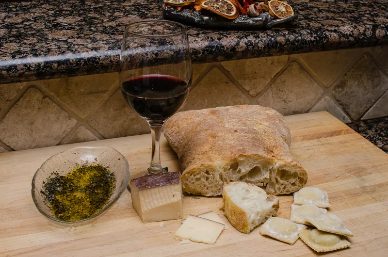 A fresh ciabatta with a chunk of Sartori Bellavitano cheese, homemade Portobello mushroom raviolis. a Chilean EVOO dipping oil and a glass of Texas Cabernet....