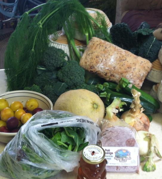 So we got some plums (2 types), local honey, salad mix, breakfast sausage, walla walla onions, brocolli, fennel, kale, zukes, fresh cantelope, and a loaf of 25% wholegrain flax seed cranberry ciabatta.