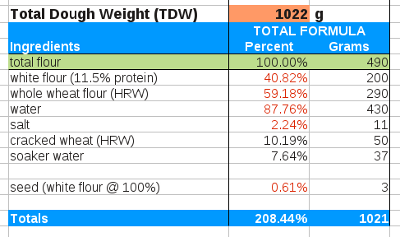 I put together the baker's percentage for myself but thought others might be interested. I'm using the formula standards promoted by the Bread Bakers Guild of America (originally posted to TFL by proth5). The first table is simply an overview of the loaf. The next table is a continuation of the first and has the details for the bread's components (sourdough levain, soaker and final dough). There is a two-stage build for the levain and the BBGA article gave no hint as to how to present this, so I did two more tables, an overview and a detail one. [h4]60% WHOLE WHEAT SOURDOUGH WITH CRACKED WHEAT[/h4][h6]Table 1A: Overview[/h6]