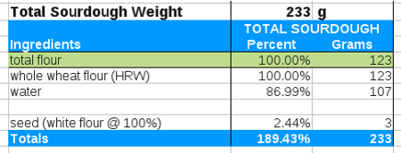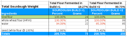 I also had to calculate the sourdough builds, which was a bit more complex. You did levain build #1 with 3 grams established white flour sourdough starter plus 39 grams WW flour and 27 grams water (90% hydration) for a total of 60 grams refreshed levain from which (when risen) you took 49 grams and refreshed it with an additonal 98 grams whole wheat flour and 86 grams water. I did my best to [i]approximate[/i] this scenario. My [i]assumption[/i] was that you wanted an initial small levain build (levain build #1) in order to ensure that your 100% hydration white flour starter would succeed with a change to a feeding of whole wheat flour. [i]If[/i] this was successful (as it was) you then proceeded in levain build #2 to feed it additional whole wheat flour and water to bring it up to the required levain amount and desired overall hydration for the starter. The basic table for the levain is Table 2A and Table 2B is [i]my approximation of your two-stage build procedure[/i].
