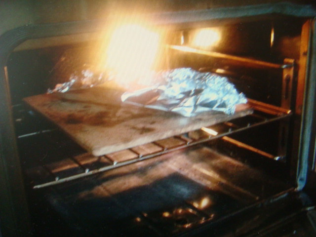 Bake for 7.5mins, remove packet from oven using peel, cut open the packet to allow all the steam to escape, and return to oven. After another 7.5 mins, remove from oven, peel foil away from loaf, return to oven, turn up oven to 500deg, turn on convection fan if you have one - this last step is to brown crust to desired finish. It takes about 10mins more, turning after 5mins for even doneness.