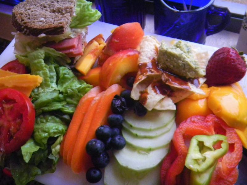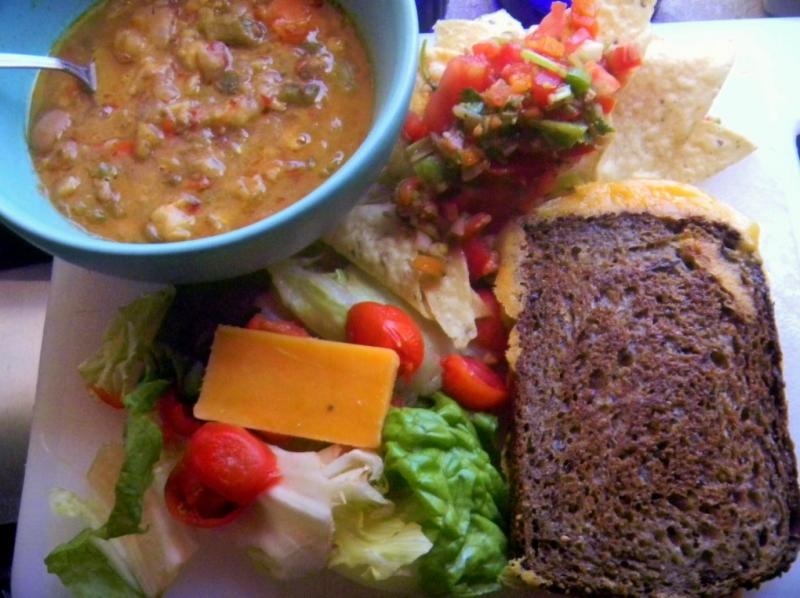 Yesterday for lunch we had left over pozole, left over salad, left over pico de gillo. But the Pico and nthe pozole were first rate and are way better the next day. The salad had the last of partially sun dried, tiny, roma tomatos from the back yard that were the best tomatoes i have ever had - ever. And, that cheddar and brie grilled cheese using the 100% whole grain multigrain bread was just delightful. T odays's lunch was more like our usual fare during summer time when fruits and veggies are plentiful and inexpensive. You just have to take advatge of that bounty!