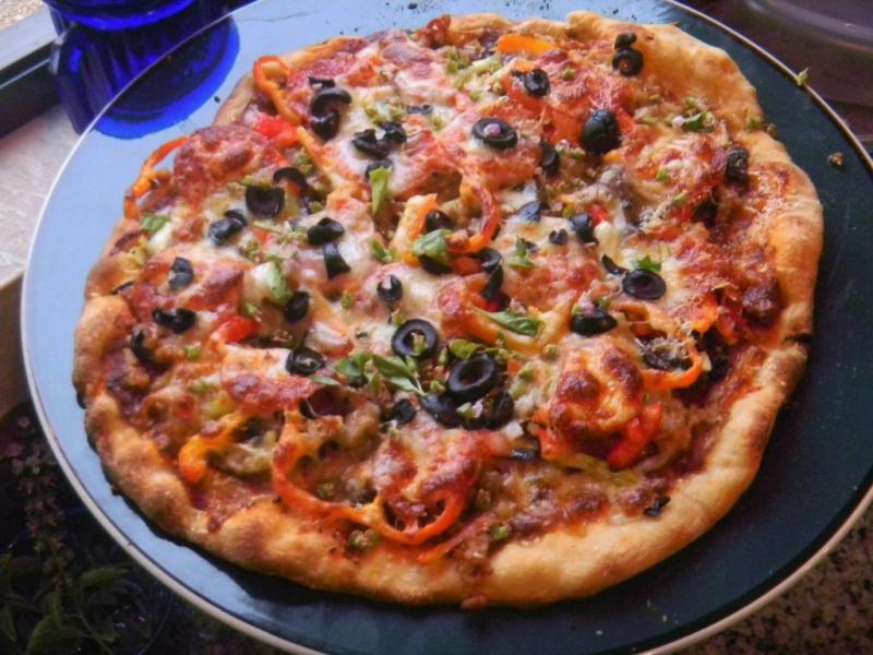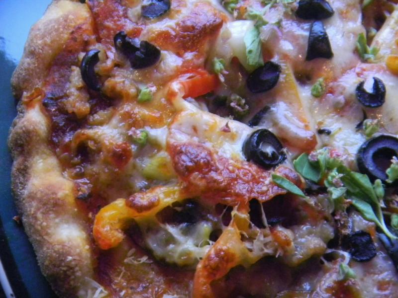 The toppings included store bought mild Italian sausage and pepperoni for the meats, mozzarella and Parmesan for the cheeses, Fresh hatch green chilies and red peppers for heat and color, caramelized red onion and mushrooms, kalamata olives and green onion with fresh basil for garnish. Not as home made or extensive as our usual but still a plentiful load when piled on.