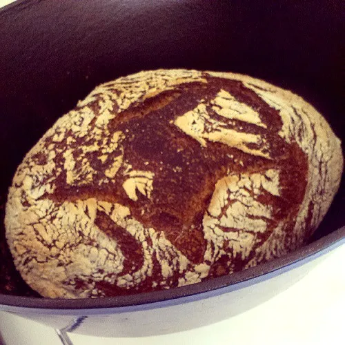 Bake into a dutch oven. 25 minutes with lid on, 20 minutes lid off. 245 C (475F)