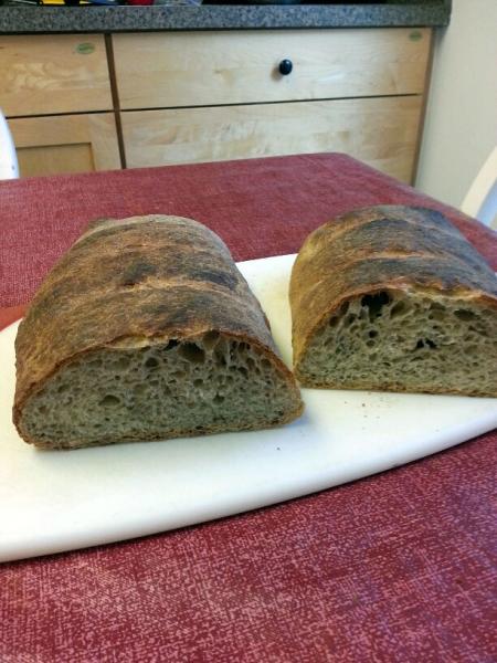 This is the results of a sourdough rye I created, using the "Caraway Rye" recipe from Fundamentals of Classic Bread Baking but adding 3 oz. of liquid sourdough starter to the rye levain.