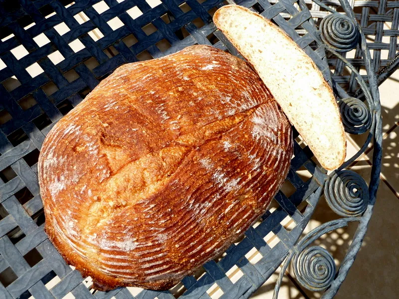 When I dumped the dough out to shape it, it flattened out right away. I unstuck it from the board, scraped it together, tried to tighten the skin (hah!) and plopped it into bannetons. It rose moderately in the banneton, but when I emptied the banneton on a peel, the loaf took the shape seen in the photo. No oven spring that I could detect.