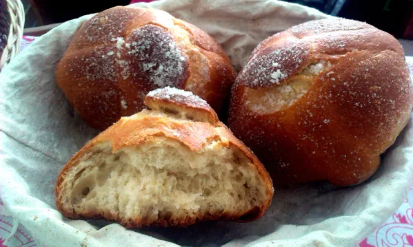 This sweet bread is eaten in Mexico to celebrate the Day of the Dead. It's a kind of brioche dough, but with less egg and less butter. The shape is round (like a tomb). You got to make some bones with the dough and cross them under a little ball to shape a kind of a skull.