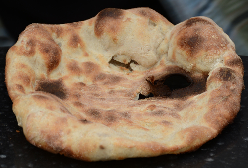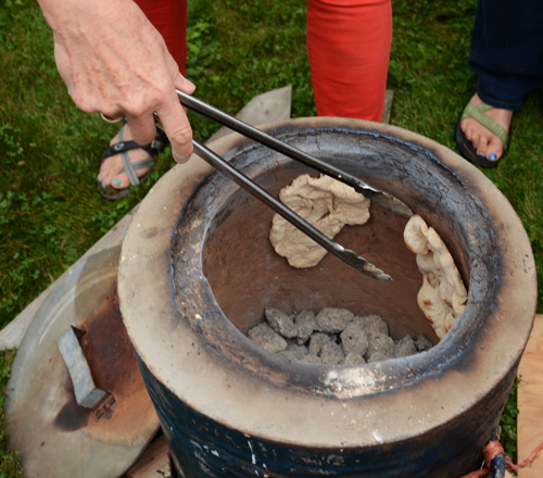 The wet side of the dough is slapped against the side of the oven (you slap towards you and never reach across the hot oven), where it sticks; as it cooks, moisture transfers into the clay and the bread starts to release when it is done. The naandle was used to place the dough in the big Tandoor oven, and oven mitts were used for the small one. When the bread looked ready, we used a pry bar to release the naan and a hook, or tongs, to remove it from the oven.