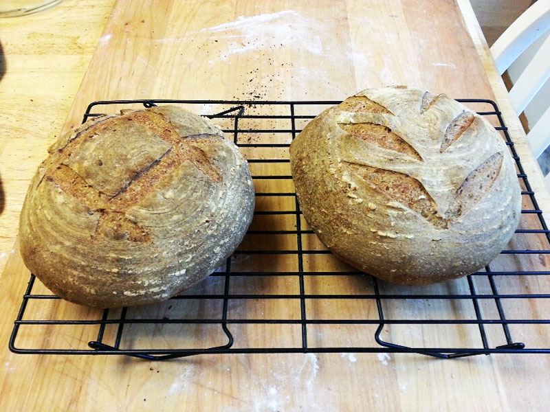 Take out of brotform, slash loaves and bake for 20-25 minutes, with steam. TIP for slashing loaves: I have found that it is easier to make a slash if the top of the loaf is slightly dry.