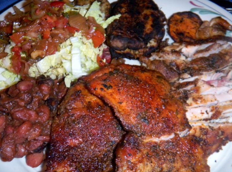 Here are the chicken thighs with some very nice Mexican beans that Lucy smoked BBQ style.