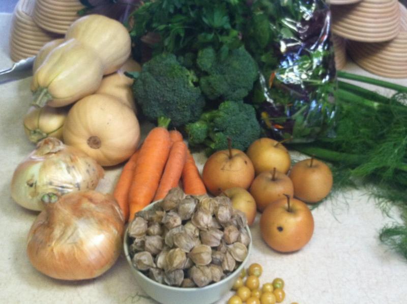 I took less as the lady is out of town and I wouldn't want to waste any food. Its the tail end of summer veggies into some winter veggies. Up front are what they call ground cherries. in the tomatillo family. sweet and a familiar taste that I just can't place but its reminiscent of something. Asian pears, walla wallas, butternut squash, some greens, fennel, Butternut squash soup here i come.
