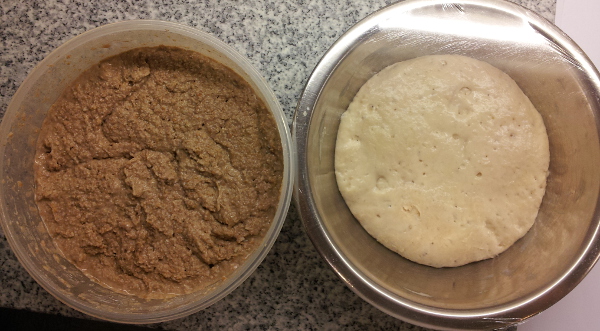 The two preferments, rye sour (100%HL) and spelt biga (60%HL)