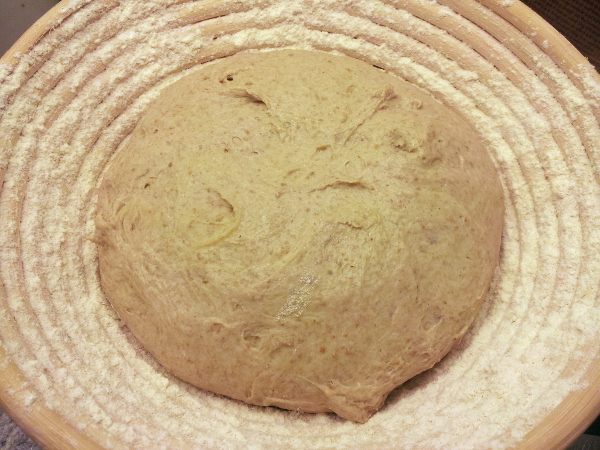 The dough is a bit sticky and fragile, after shaping with a light hand left to proof in a basket: