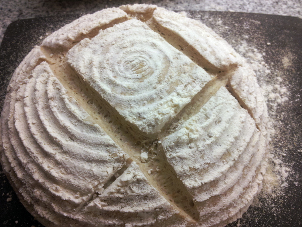 After this I turn the loaf out onto a peel sprinkled with semolina, and slash: