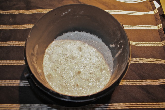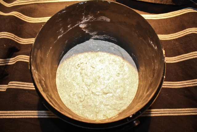 The next morning, I take the tub out of the fridge and leave it out at room temperature, then off to work. The sponge is looking limp and lumpy, so not a lot has gone on overnight.