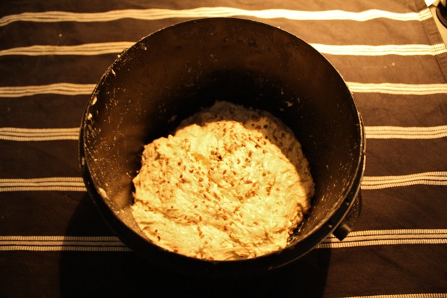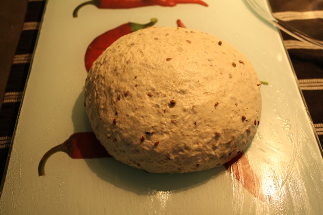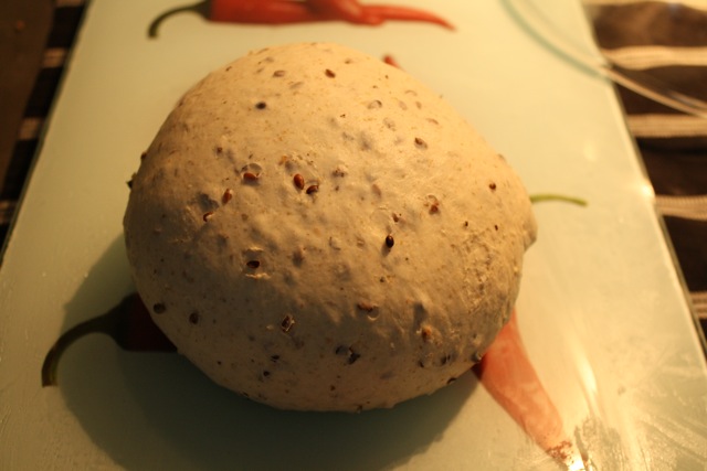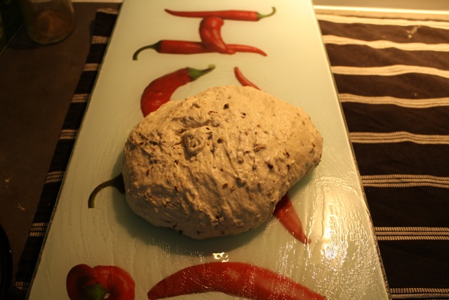I add another 300g of strong white flour, 10g salt and 100g cold, filtered water, a good glug of olive oil and mix it thoroughly by hand. I also throw in a tablespoon of linseeds and a tablespoon of toasted, crushed hemp seeds. Now it just looks like a crude dough. That took about 3 minutes.