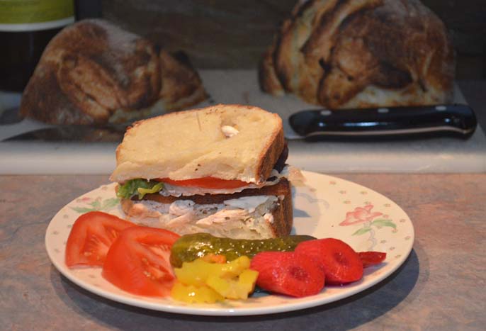 . . . first time I have smoked a whole chicken as my smoker is fairly new. I think I ate about half the bird last night and think it actually got better overnight. Between the fresh bread, home smoked bacon and chicken, that was one fine tasting club house sandwich.