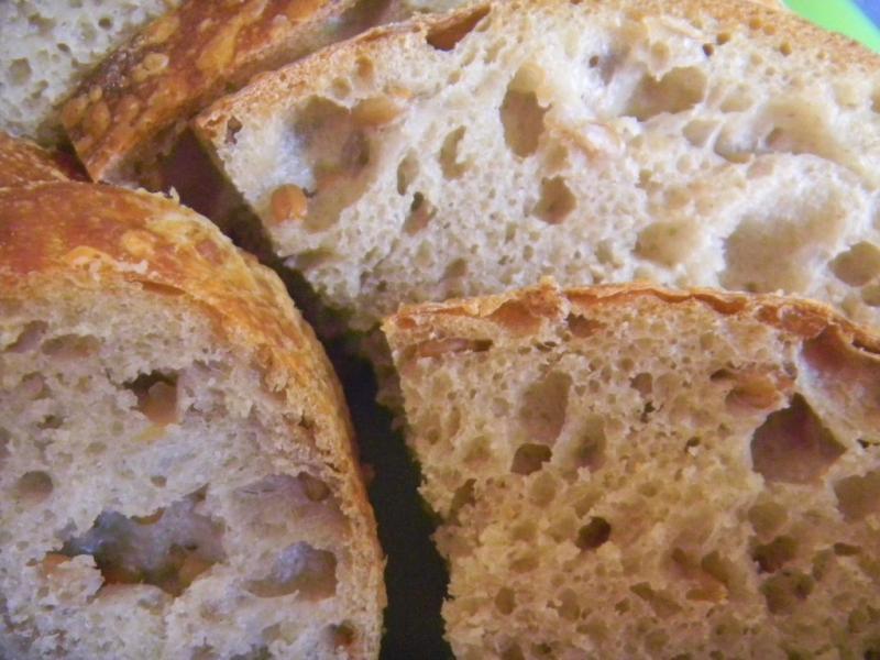 I;m thinking when they went into the oven and I am glad they puffed themselves up, but not too much, rather than deflating. This happened one othertime with David's Pugliesi Caprriocco (SP?) only it has less whole grain and the hles were bigger. These are pretty good tasting breads (I'm guessing on the SD one since I froze it whole) with just enough hole grains to give them decent flavor.