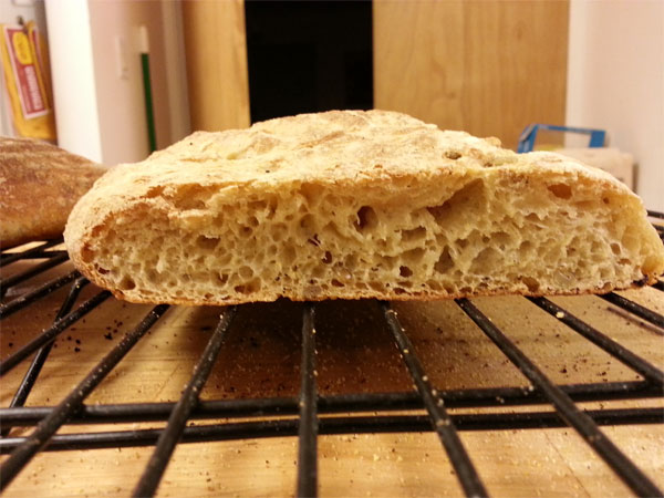 The crumb is nice and full of bubbles, even though it's FLAT. It came out looking like a ciabatta, which I haven't been able to achieve when I try to intentionally make ciabatta!