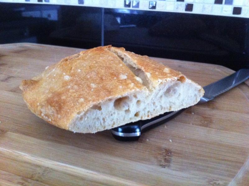 The remaining dough I made into a small loaf. In the pic the teeny 'loaf' (more like a large roll) is sitting on the knife handle so as to illustrate the crumb. The oven spring was amazingly good, the crust was nice, and the flavor excellent. I try to eat low carb during the week (and eat carbs during the weekend) but this little guy was tasty and I lopped off 2 slices and ate them with butter. I think I'll try Jason's Ciabatta next.