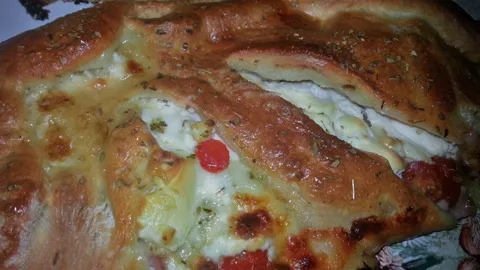 I used five cups flour and two cups starter, I think that is about what I did. After the rise it was enough to make three calzones. TRULY only use whole milk products when making this, makes a big differance. Hey shoot me some pics, would love to post on our site. Oh...Dont forget to score the zone.