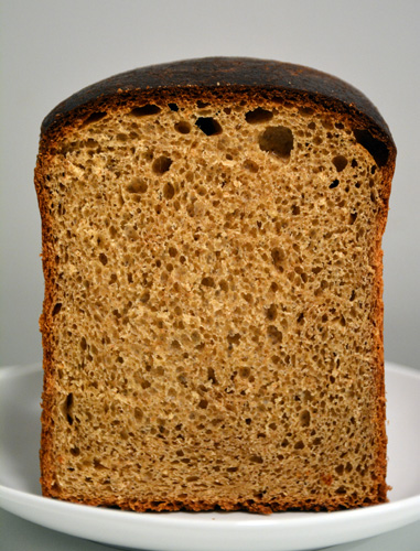 This is a continuation of my spelt brioche experimentation. This time I used 50% AP flour, 50% spelt flour, 50% unsalted butter, 32% eggs, 20% yogurt, 16% palm sugar/sucanat mixture, 2.5% salt, and a little instant dry yeast. I prefermented 20% of the flour in a liquid levain at 100% hydration using my rye SD starter. I am pretty happy with the result. It's a tangy bread due to the yogurt and liquid levain. I think next time I can up the sugar level... My total dough weight was approx 1200g, divivided between two 4.5" cube pullman pans. The dough only filled up about 1/4" the pan and had risen overnight to maybe 1" from the top. The oven spring was impressive, about 1" over the pan.