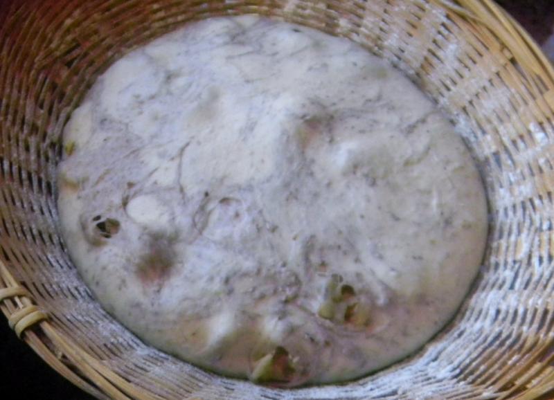 When we took the dough out this afternoon we saw the purple streaks that the walnuts had left in the dough as it did its cold proof and noticed it was right at 85 % proof too. We took it out of the fridge to finish its proofing as the mini oven heated up to 500 F.