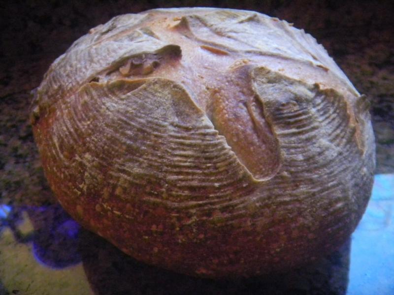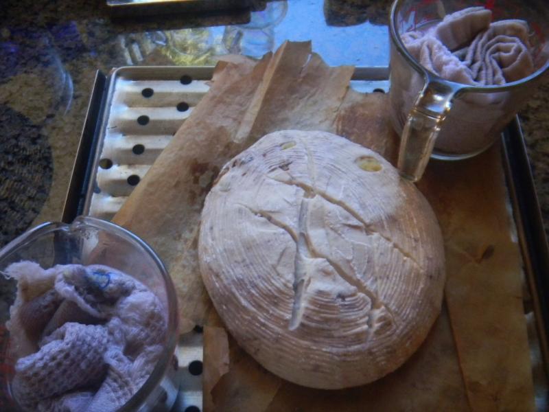 We used (2) of Sylvia’s steaming cups to get mega steam in the mini oven. We un-molded the bread onto the vented top of the mini’s broiler pan that was covered in parchment paper, did a quick diamond slash and into the mini the whole assembly went.