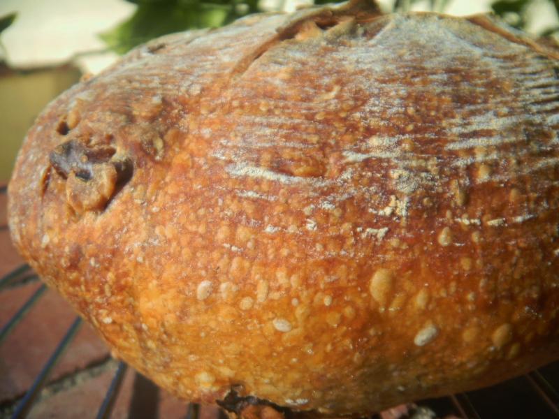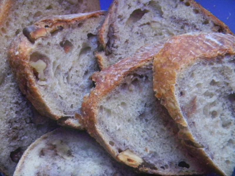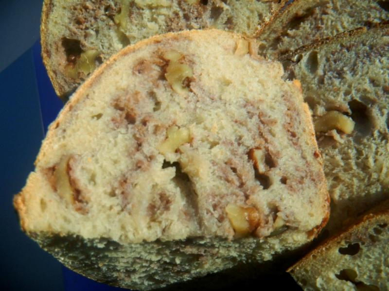 The bread browned very well and the blisters the mini oven is famous for showed up again to make a very handsome loaf. the inside is just as pretty with the purple splotches of walnut contrasting with the crumb soft off white. The crumb wasn't as open as we thought it would be with the great spring and bloom but it was soft and moist. It tastes less sour than out usual due to so many feedings of the levain but the walnuts make up for it. Too good for stuffing croutons - heaven's no! Merry Christmas to all!