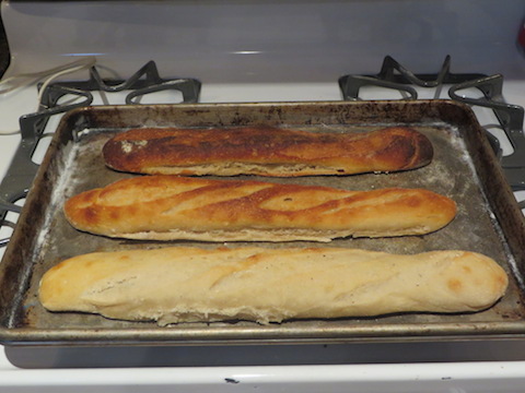 The results? Taste, crust and crumb were pretty close among the three loaves. There certainly was not any significant fall-off in quality among the bake-n-serve loaves. Since I seem to always make too much bread, this is an experiment I’m going to repeat on a regular basis so family and friends always have a supply of fresh baguettes, crispy and warm from the oven.