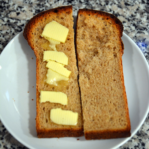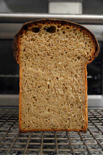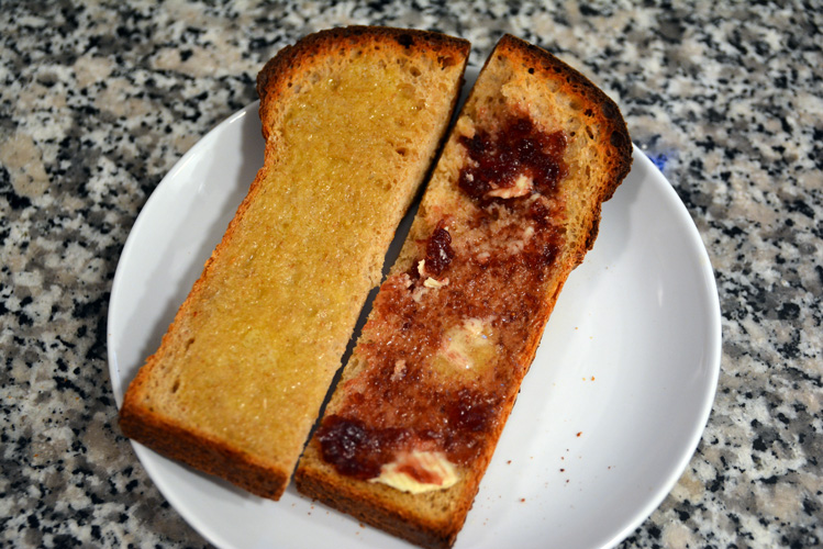 Crumbshot! Pretty nice, but was did not have the shreddable crumb that I was looking for. What it did have was a nice slightly sweet taste, and it toasts up very well. See photos below with butter and grape jelly...