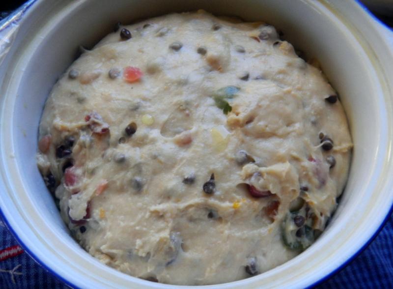 Lucy cut the recipe in half, dropped the commercial yeast and used the same amount of YW levain in its place. So this is another SD /YW combo levain panettone attempts. We also added 40 more grams of snockered fruits to the mix that included, candied pineapple, lemon and orange peel, green and red cherries, raisins, cranberries, prunes apricot and citron. She also chucked in 100g of mini chocolate chips.