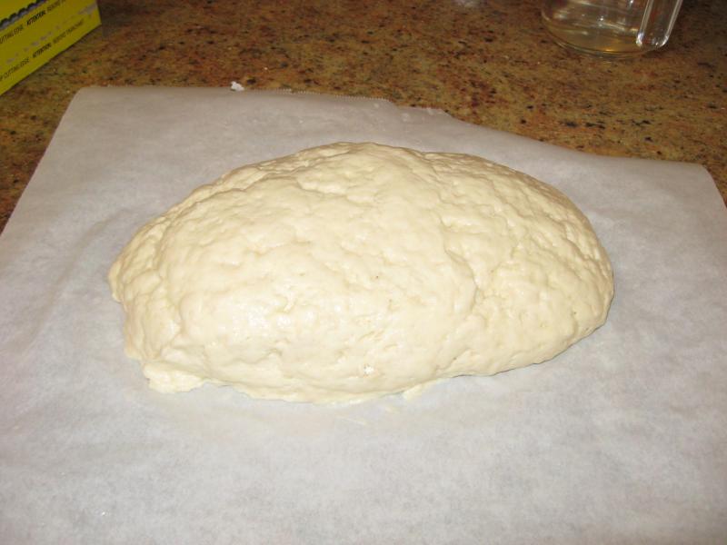 Here's what it looked like, shaped on parchment, ready for a one-hour proof (you mould it more like clay - or dense meringue - instead of stretch and form like regular wheat-based dough):