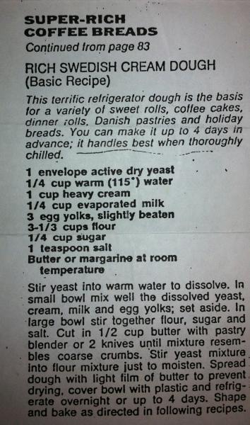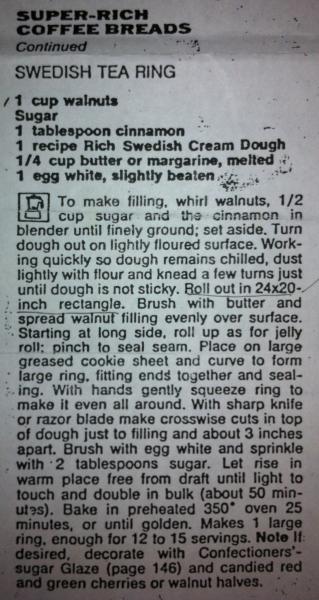 The pastry is a "Swedish Tea Ring" ... I know of a few versions of the recipe. I can post if there is any interest.