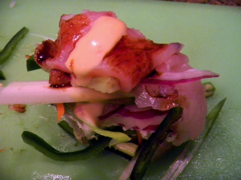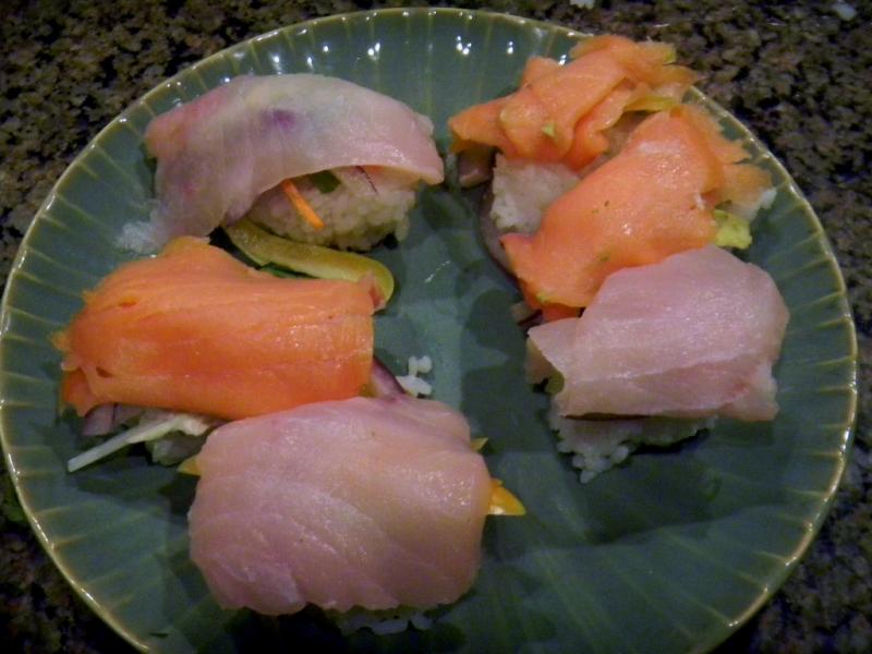 Most Sushi Masters around here are Mexican's dressed up to look like Japanese ones so I like to put Poblano , Serrano and Yellow Cubana peppers on our nigiri. in their honor. Here is one for Mike that shows a swordfish one all dressed up with spicy mayo, made with real Japanese Sansho peppers and eel sauce that is not made with real eels like it is in Japan :-) Lucy subbed thick, dark, mushroom flavored soy for eels instead. It has every condiment on top of the rice - the peppers, carrot, cukes, cream cheese, green and red onion, celery, avocado.....