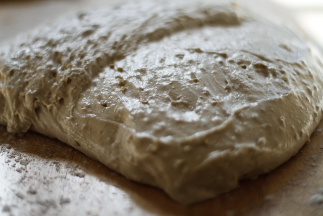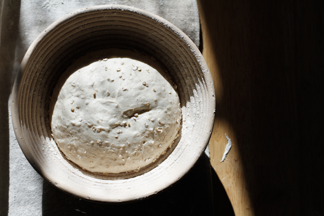 First I combined the water and the chef then added the two to the flour/oat mixture, after incorporating everything I let it autolyse for 45 minutes, that completed I gave it a stretch and fold, spread the salt on the counter and gave it a good set of slap and folds, allowing it to grab some of the salt with each slap. Then I let it ferment at our albeit quite cool room temp for around two hour and I gave it a stretch and fold roughly every forty minutes. Then I tossed it in the fridge and gave it a gentle S&F at the one hour mark and the twoish hour mark.